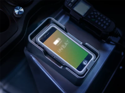 Dieses Ablagefach unterstützt das kabellos induktive Laden von Smartphones mittels INBAY.
