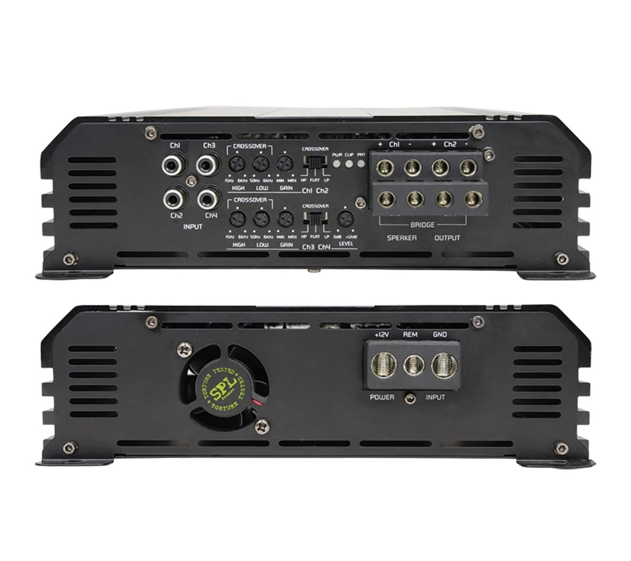 - 4-Kanal 1-Ohm stabiler Breitband SPL-Hochleistungsverstärker mit Class D Schaltung, integrierter Aktivweiche und Bass Boost